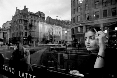 约迪・科布摄于1999年 英国,伦敦。一位年轻女子停下脚步,喝着咖啡,陷入沉思。伦敦吸引着追求时髦和对未来充满憧憬的年轻人。