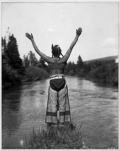 摄于1916年美国,冰河国家公园,蒙大拿。黑脚印第安人向太阳神祈祷的背影。