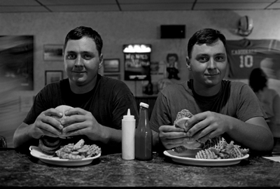 乔尔・萨尔托雷摄于1998年 美国,内布拉斯加州,牛津市。一对孪生农民兄弟在穆尔・斯金纳沙龙愉快地进餐。