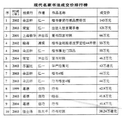 上述二人的作品在市场上价格最高。目前,现代书法成交排行榜前十位中基本被弘一和齐白石占据,其中弘一占有6幅、齐白石占有2幅。弘一法师的作品之所以屡创佳绩、经久不衰,主要得力于弘一法师高尚的人品和高超的书法。而齐白石的书法主要得力于强烈的个性和无可争议的绘画大师地位。未来仍将是市场上的抢手货。
