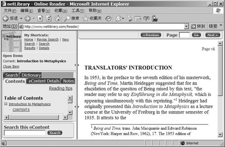 教材和工具书是另两个e Book最有发展前景的领域。在北美,高校学生的很大一部分支出要花费在那些昂贵但必须的教材上,不少经典著作的售价高达50至60美元,因此相关e Book的出现当然是学生们所渴望的。2004年下半年,老牌的教育图书出版商培生集团(Pear鄄sonEducation)开始涉足这个领域;它通过旗下的在线图书馆SafariBooksOn鄄line推出了一个名为Safarix的计划。这种针对大学生的服务按册收费;举例来说,培生集团下属的PrenticeHall出版社的名著《二战简史(第四版)》(WorldWarII AShortHistory,FourthEdition),原书售价为53.67美元,但一个历史系学生只要支付纸质书一半的价格,就可以借助普通浏览器在Safarix网站上阅读该书,使用期限为150天。不少学生手头拮据,但一直享受着学校提供的宽带网络环境;对于他们来说,加入Safarix计划是一种相当可行的教材消费方式。市场营销学大师科特勒(PhilipKotler)也有三部名著入选了这一计划;谈到这一服务模式的前景,大师满口称赞:“Safarix勇于创新、热情周到,给学生和教师们带来了一种全新的选择。”