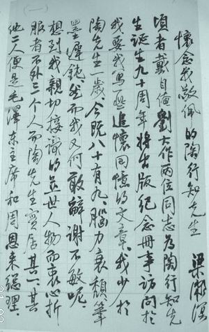 黄敏兰先生文章说到梁先生盛赞教育家陶行知的人品,那是几十年如一的。上世纪20年代末、30年代初陶先生在南京市郊创办晓庄师范,推行平民教育,梁先生曾经去参观,并写了文章称赞。我父亲是陶行知先生的学生,实际上他去晓庄前师范已经毕业,在晓庄主要是在陶先生指导下从事乡村教育试验工作。梁先生那篇文章曾经被我父亲和孙铭勋收入他们编辑的《晓庄批判》一书。需要指出的是,当时“批判”的含义与解放后历次运动所说的“批判”大不一样,更多是评论的意思。后来在山东邹平乡村教育试验区,我父亲又和梁先生共过事,当时在那里的还有诗人臧克家先生。梁先生结婚很晚,抗战时期才在桂林结婚,我父母还有幸参加过他的婚礼。我父亲早年出版的书大多由陶行知先生题写书名,但在桂林出版的一本书却是请梁先生题写的。解放后陶先生、梁先生都曾遭遇不公正待遇,我父亲也于1957年在教育部戴上“右派”帽子。1981年10月18日在北京举行陶行知先生诞辰九十周年纪念大会,邓颖超同志主持,情况有了变化。为编辑出版《纪念陶行知》一书,我父亲才又登门拜访已近三十年没联系的梁先生,请他写文章。该书后来(1984年)由湖南教育出版社出版,在题为《怀念我敬佩的陶行知先生》的文章中,梁先生说:“想到我亲切结识的盖世人物而衷心折服者不外三个人。而陶先生实居其一,其他二人便是毛泽东主席和周恩来总理。”