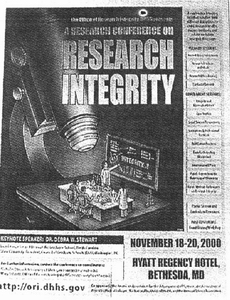 一台巨大的显微镜;在载物台上的不是普通的生物切片,而是一群进行研究工作的科学家。这是2000年11月贝塞斯达大会宣传画的内容。那次大会的主题是“探讨研究的诚信”。这幅宣传画作为插图,出现在《科学家的不端行为――捏造・篡改・剽窃》一书中。