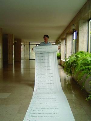 8月4日,这首诗在法国东南部尚皮耶的一家赛车场内展出。诗写在一大卷布上,长度几近一公里(994.1米),需要用拖车帮忙才能展开。