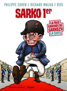 《萨科一世》共160页,首印8万册,内容是今年法国总统大选过程中,围绕着萨科齐发生的种种趣事和秘闻,依然未变的,是对他的调侃风格。在此书封面上,打扮成拿破仑模样的萨科齐,正走在通往王宫的红地毯上。