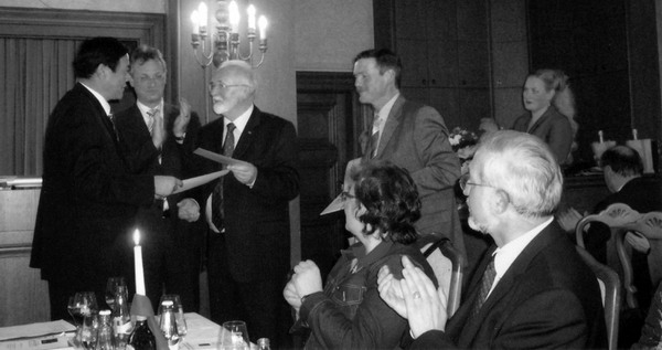 左起第二位依次为国务部长施耐德,青少年文学院院长弗朗兹,福尔卡赫市市长科耐尔,他们正在为大奖获得者陈俊授奖。