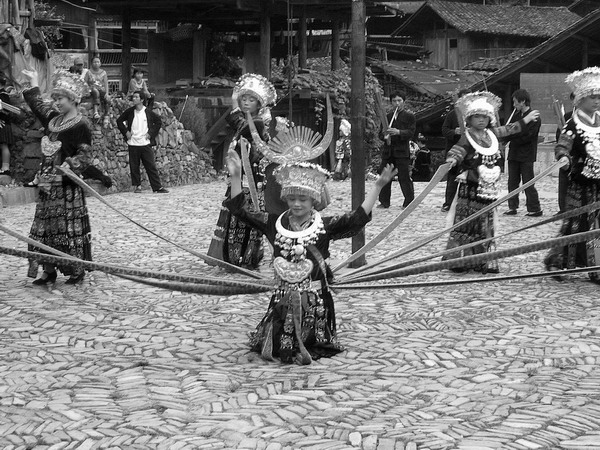 苗族姑娘盛装表演锦鸡舞,她们身后的本村