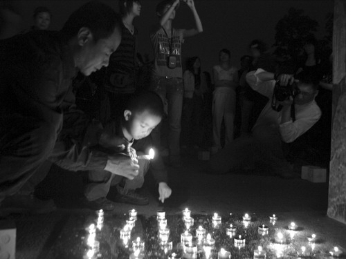 蓓、谭五昌、秦晓宇、刘丽朵、张杰、白木以及中央美院“空白诗社”、北大、人大、清华、北师大的年轻诗人参加了在中央美院的烛光悼念和朗诵活动。上千美院学生手持烛火为汶川大地震中的死难者默哀。在中央美院学生集体朗诵屈原的《招魂》后,诗人多多、王家新、孙磊等朗诵了他们的诗作。“父亲失去了儿子/孩子失去了母亲/失去,还在失去/失去,还在冒烟/而我失去了你――语言/你已被悲痛烧成了灰烬”,这是诗人王家新在烛光悼念中所朗诵的“哀歌”,它表达了一个中国诗人在这场巨大的民族劫难中的悲痛之情。