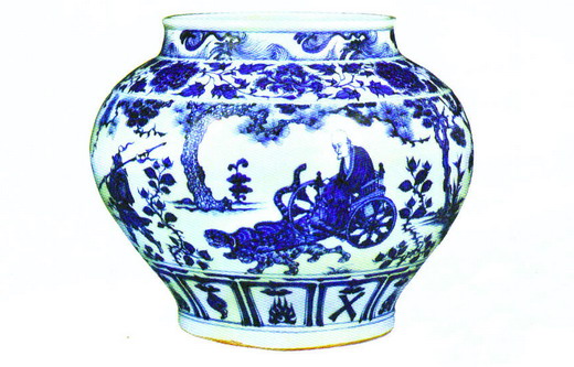 画有人物纹的元代青花罐非常罕见,全世界不足十个,分别藏在博物馆和私人手里。主要有东京出光美术馆藏的“昭君出塞”青花罐、美国波士顿美术馆藏的“尉迟恭救主”青花罐、日本大阪万野美术馆藏的“百花亭”青花罐、英国铁路基金会藏的“锦香亭”青花罐、苏富比在1996年拍卖的“三顾茅庐”青花罐,还有“西厢记”、“细柳营”两个青花罐,都为私人收藏。就是这么大的画人物的罐子,全世界就这点儿,所以就变得非常贵。