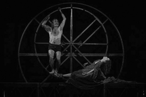哈泽基斯的舞台布景十分简约素朴,暗藏玄机。舞台中央是普罗米修斯被铁链锁住的岩石,是一大一小重叠的两重圆环的铁架构造,小的圆环可以旋转(剧末他就被赫尔墨斯旋转倒置,寓意着被宙斯打入无底深渊)。铁环外侧两边各一副梯子,便于剧中的女角色伊娥顺着梯子爬上“岩石”与普罗米修斯照面。这个铁环架子是偌大的舞台上唯一的布景。导演到底有何玄机?据现场发放的小册子中“导演按语”自承,铁环的设计是在呼应达芬奇绘制的名画《维特鲁威人》(Homo Vitruvianus)中方圆结合的构图,只着一条黑色短裤、身体其余部分赤裸的普罗米修斯在圆环内或伸展四肢或蜷居一隅,形态上确实像是一个活动的“维特鲁威人”。不过据我猜测,哈泽基斯做此布景的目的并非为展示男性身体匀称的比例结构(如达芬奇),而是为了表现普罗米修斯“被缚”的方式――我理解为“作茧自缚”。这就涉及到此剧的舞台美学背后的寓意了。