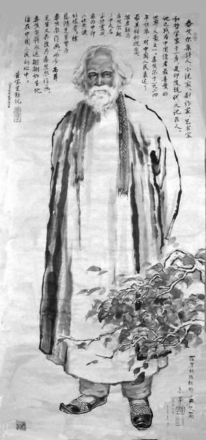 2007年我画了一幅泰戈尔肖像,请我国印度文学研究会会长黄宝生先生题词。他写道:梁启超曾为泰戈尔起过中文名字“竺震旦”(意为“中印文化交流的使者”),又说泰戈尔“是印度现代文化巨人、他已成为中国读者最喜爱的世界文豪之一。”