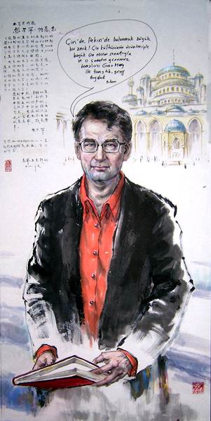 我为他画了一幅肖像。展示给他看。他先是一惊,然后高兴地笑了。我请他签名留念。他问:“用哪国文字?”我说:土耳其文,于是他写下了如此一段文字:
