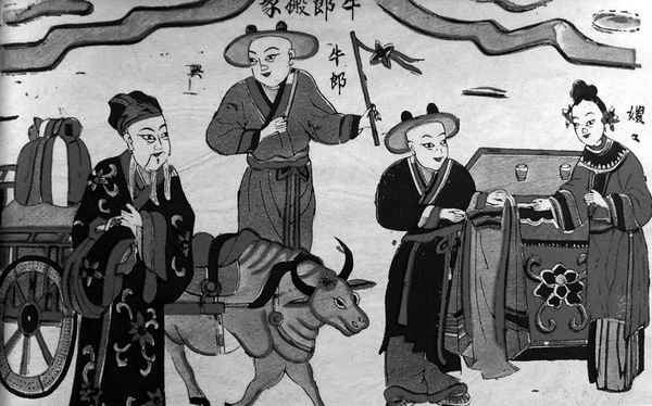 这是宋朝的秦观以七夕节为题材创作的一首名为《鹊桥仙》的词。七夕节又名“乞巧节”,是中国传统节日中最具浪漫色彩的。七夕节的主人公,一个牛郎、一个织女,都是农耕社会的形象。牛郎、织女的神话传说起源很早,大概与古人对星辰的崇拜有关。牛郎和织女,在我国很早就被称为“双星”。位于天河西面由六颗星组成的牛宿星,分布形状看上去像牛的轮廓;东面是织女星,在它的东南方还分布有像一部织布机形状的四颗星。两个星座相对,像一对恋人含情脉脉,遥相凝望。到每年农历的七月初,两星的距离在人们视觉上最近。这种神秘的天象,激发了民间创作的想象,由此引发出了美丽的爱情故事。《诗经・大东》中最早记录了牛郎、织女的情事: