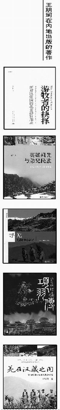 近年,他在内地累计出版了《华夏边缘――历史记忆与族群认同》(社会科学文献出版社,2006年4月)、《楚乡悲歌:项羽传》(广西师范大学出版社,2007年12月)、《羌在汉藏之间――川西羌族的历史人类学研究》(中华书局,2008年5月;入选《中华读书报》2008年度“十佳”图书)和《游牧者的抉择:面对汉帝国的北亚游牧部族》(广西师范大学出版社,2008年12月)、《寻羌:羌乡田野杂记》(中华书局,2009年5月)、《英雄祖先与弟兄民族:根基历史的文本与情境》(中华书局,2009年7月)。此间,王明珂还整理出版了史语所前辈黎光明?王元辉合著的极具民族志价值的《川西民俗调查记录1929》(原名为“川康民俗调查报告”)。