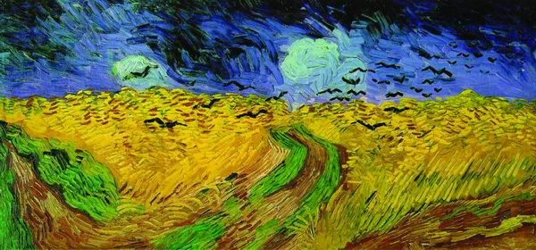 该如何去想象梵高最后画《麦田上的乌鸦》抬起的手呢?这是一幅用刮刀直接上色的作品,韧性的画笔已经抛弃了梵高,画面被看不见的地平线拦腰从中斩断,柠檬黄的麦田正在成熟,红褐色的点彩是它过剩的力量,像液体一样喷溅,而橙色的麦秆无力支撑生命的重负,倒伏在路旁。翻卷涌动的云层蓝得发暗,它们遮蔽了太阳的热力使自己成为乌云。3条毫不交叉的泥褐色小路带着象征着希望的草绿一去不复返。画面中惊心悚目的是一群扇动着强硬翅膀的乌鸦,它们张皇无主地在麦田上低飞,仿佛在命运前碰壁无数后,死亡的本能在看不见的远方向它们发出致命的召唤。这幅画是梵高的心灵向人世这个全景式监狱的最后一次突围。他是多么希望在他活着的时候,冷酷的世界能多一个温情的声音啊。