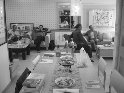 在方明诗屋.左起张默、管管、古远清,右为林静助