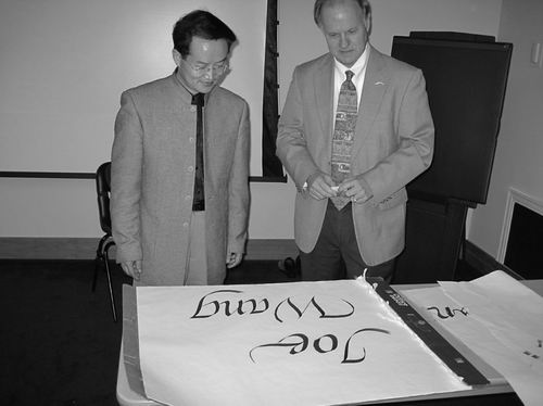 在肯尼索州立大学讲演,由肯尼索州立大学副校长Joe.F.Dede主持,这位有深邃文化眼光的副校长说:“中国奥运开幕式使得中国书法为国际社会所欣赏和重视,美国书法家也应该发展西方的书法,同东方大国中国书法进行多方面的交流,使人类获得书写的美感和精神享受。”我回答道:“古老中国的书法文化过去是汉字文化圈的文化瑰宝,在全球化的今天,应该随着全世界的孔子学院的发展而拓展新的文化空间。同时,在当今世界的‘汉语热’中推进从汉字学习到书法延伸的大文化交流,使中美两国的书法艺术得以交流和传承。”