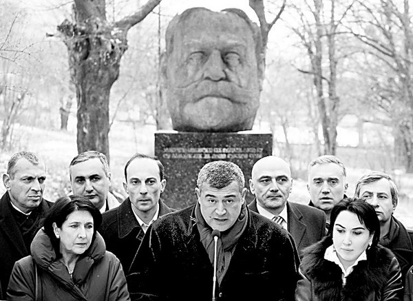 1月3日,在格鲁吉亚首都第比利斯郊外的萨古拉莫村,格反对派总统候选人列万・加切奇拉泽(中)发布施政纲领。