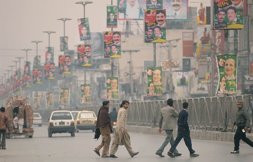 1月5日,在巴基斯坦北部城市拉瓦尔品第,几名男子在横穿马路,马路旁的电线杆上悬挂着各个党派的众多竞选标语。当天,巴基斯坦总统穆沙拉夫表示,从1月8日推迟至2月18日的议会选举,不会被再度推迟。新