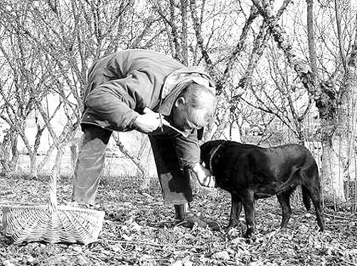 在意大利,人们更喜欢用经过训练的雌性猎犬来寻找白松露。通常,猎犬会用它的爪子在松露所在的位置上做个记号,等主人来后用小耙子小心翼翼地从土壤中将珍贵的松露挖出来。训练一只会寻找松露的猎犬要经过复杂的过程,首先是训练狗把丢出去的球叼回来,然后用奶酪代替球,继而把奶酪藏起来让狗去把它找出来,最后再用小块松露代替奶酪,让狗找到并挖出来。这样一条经过训练的猎犬,在市场上可以卖到3000欧元。在寻找松露的前一夜,猎人通常不给猎犬吃东西,这样猎犬为了换取食物作为奖励,会更加努力地去寻找松露。