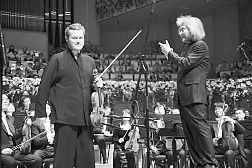 上图:世界指挥大师小泽征尔(右)和俄罗斯小提琴演奏家瓦第・列宾在国家大剧院2008新年音乐会上。(资料照片)