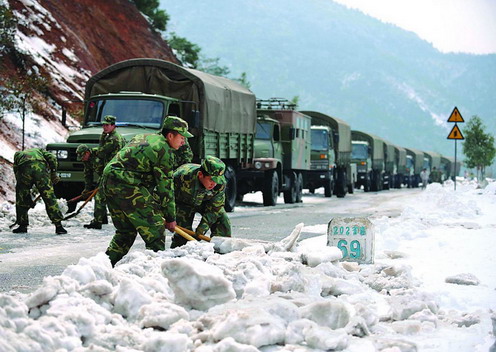 2月3日,在省道202线广西资源段,塔山英雄团的战士们在奋力铲雪。当日,解放军某部官兵开进广西资源县,在资源县城通往外界的“生命线”――省道202线上开展除冰作业,确保生命线畅通。自2008年1月13日