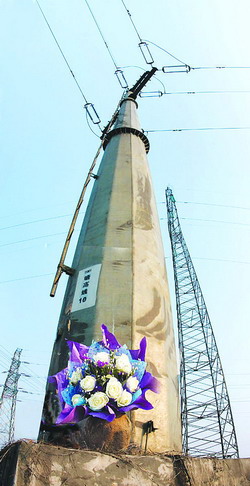 图为2月15日下午,曹响林班里的同事把一束鲜花献在塘高线10号塔前,他们说:这座高塔就是曹响林永恒的雕像。 唐大柏摄 |