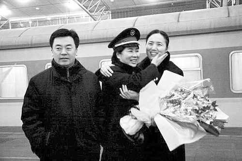 ▲除夕夜,王红(中)回到沈阳,受到英雄般欢迎。李飞摄