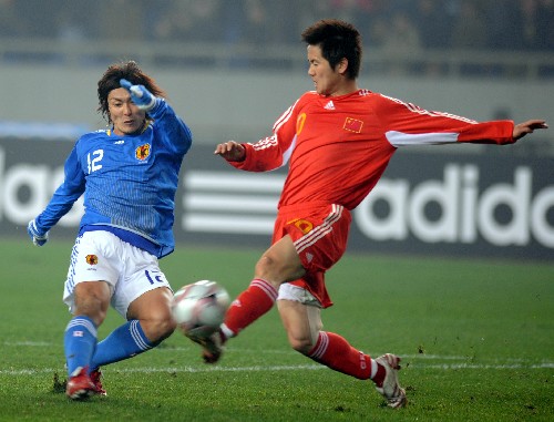 2月20日,日本队队员田代有三(左)与中国队队员肇俊哲拼抢。当日,中国队在东亚四强赛上,以0比1负于日本队。