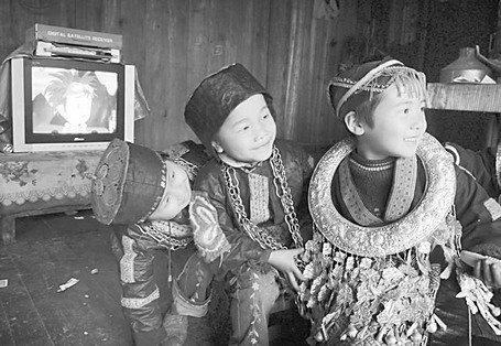 3月14日,苗岭大山深处的剑河县南甲村三位苗族小朋友在电视机前玩耍。经过贵州省各级广播电视系统工作人员的艰苦努力,到2007年末,贵州省20413个行政村全部实现了村村通广播电视的目标,偏远的苗寨侗乡都能观看到数十个