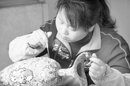 将焊好丝的胎体再进行酸洗、平活、整丝后,用吸管将各种釉料点入丝组成的图案空隙处的过程称为点琅。图为年轻的工艺师在进行“点琅”作业。袁泉摄