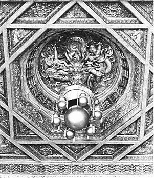 太和殿藻井:金銮宝座上方的天花正中,有一向上窿起的藻井。藻井的基本含义是以水克水,常常装饰于重要殿宇,从而也具有显示建筑等级的作用。藻井内雕有蟠龙,其中内所衔宝珠称轩辕镜,是内涂水银的玻璃球。借以象征轩辕星,暗喻殿宇受雷雨之神的庇护。