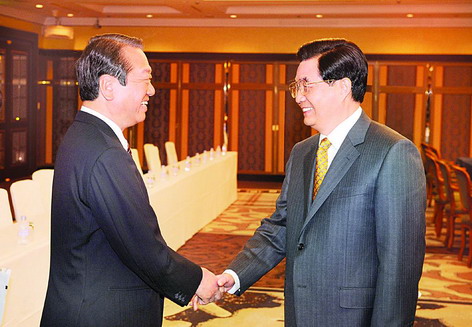 五月七日,国家主席胡锦涛在东京会见日本自民党主要负责人伊吹文明。