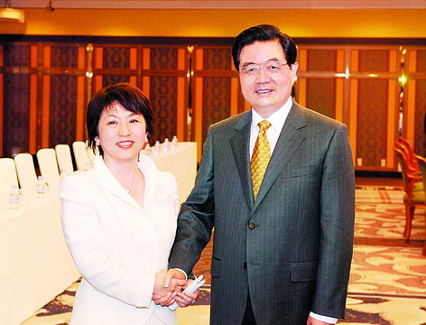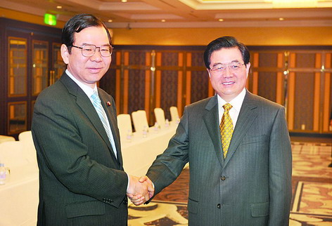 五月七日,国家主席胡锦涛在东京会见日本公明党代表太田昭宏。