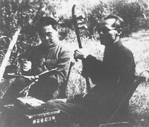 图为1979年,黄挥和艺人戴望本(右)正在整理记录常德丝弦音乐曲谱。