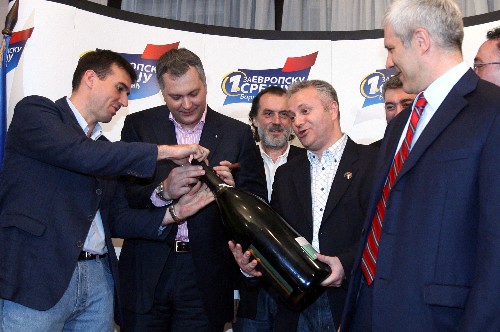 图为5月11日,塞尔维亚总统塔迪奇(右一)等在贝尔格莱德的本党总部庆祝议会选举胜利。新华社发