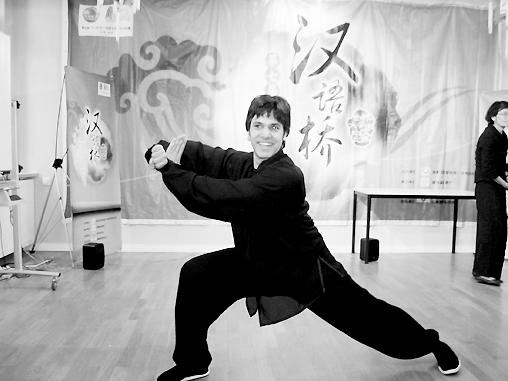 图为获得大学生中文比赛德国区预赛一等奖的李追风在展示他在峨眉山苦练8个月学来的“真功夫”。简涛摄