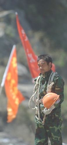 5月19日14时28分起,正在宝成铁路109隧道日夜奋战的抢险人员为汶川特大地震遇难者默哀。