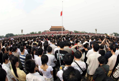 5月19日14时28分,人们在北京天安门广场为汶川特大地震遇难者默哀。新华社记者汪永基摄