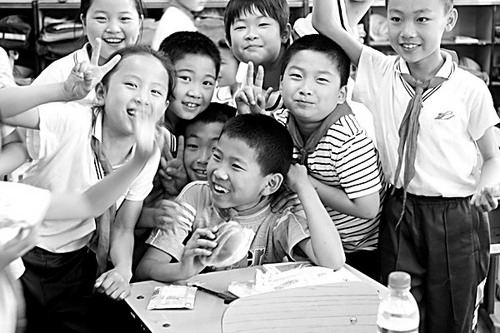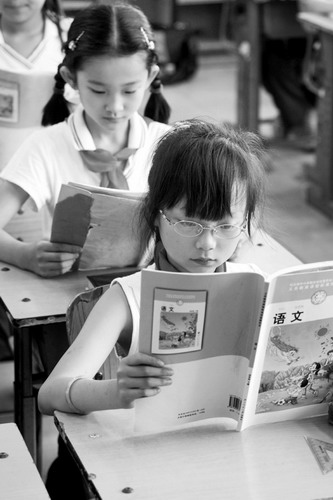 北京海淀区第二实验小学最近先后接收了来自四川江油、绵阳等灾区的8位小学生进校免费就读,他们家乡的校舍已成危楼。上图:来自江油的申舒玮(前中)和热情似火的新同学们的关系就像是老相识。下图:来自江油的杨璐