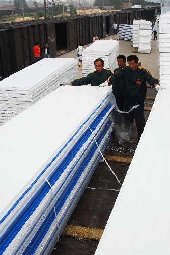 6月3日,装卸工人在烟台火车站搬运准备发往地震灾区的活动板房材料。当日,山东省烟台市首批1000套抗震性能较好的活动板房开始装车,运往四川灾区。据悉,烟台市将分3批援建四川地震灾区活动板房共6000套。