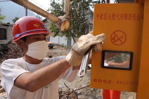 6月5日,平武县天然气公司抢险人员正在南坝镇拆除被毁的供气设备。当日,四川省平武县南坝镇地震重灾区进入废墟清理阶段。来自济南军区、成都军区某部千余名官兵鏖战酷暑,坚守一线,会同当地政府和受灾群众一起清理建筑