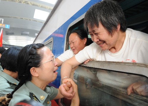 6月11日,康复的伤员与前来送行的护士依依不舍。当日,78位来自四川灾区的伤病员在武汉乘坐T246次特快列车返乡。