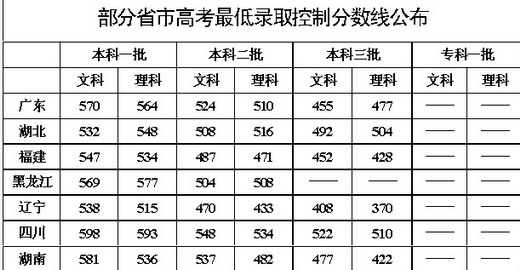 本报北京6月27日电截至到27日下午,全国已经有27个省区市公布2008年高考最低录取控制分数线。广东、辽宁、湖北、四川、福建、湖南、黑龙江等地2008年高考最低录取控制分数线如下表。