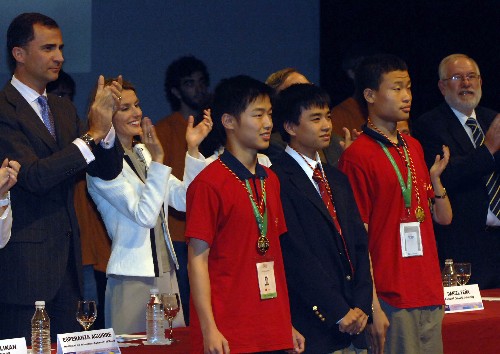 7月21日,西班牙王储费利佩(后左一)和王妃莱蒂西亚(后左二)等为国际数学奥林匹克竞赛三位满分获得者鼓掌,中国队选手牟晓生(前左一)、韦东奕(前左三)及美国选手阿历克斯・