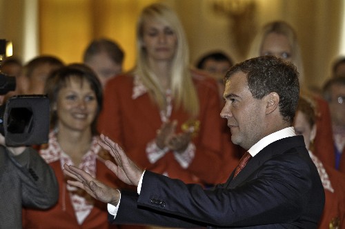 图为俄罗斯总统梅德韦杰夫(右)与运动员们交谈。新华社发