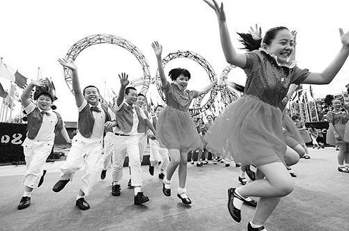 8月1日,北京市宣武区师范学校附属第一小学的“同心结”学校合唱团小演员们在奥运村的五环下享受奥林匹克带来的喜悦。