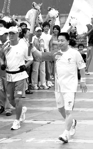 8月6日,第一棒火炬手杨利伟手持火炬传递。当日,北京奥运圣火在北京市传递。本报记者谌强摄