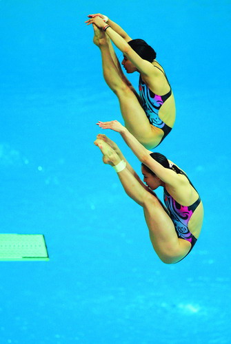 跳水女子双人3米跳板冠军郭晶晶(上)/吴敏霞在决赛中。