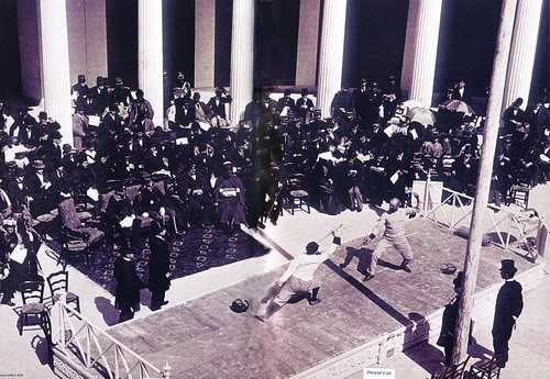 1896年第1届雅典奥运会。击剑比赛在扎皮翁宫举行,希腊国王和各界名流纷纷到场观看。